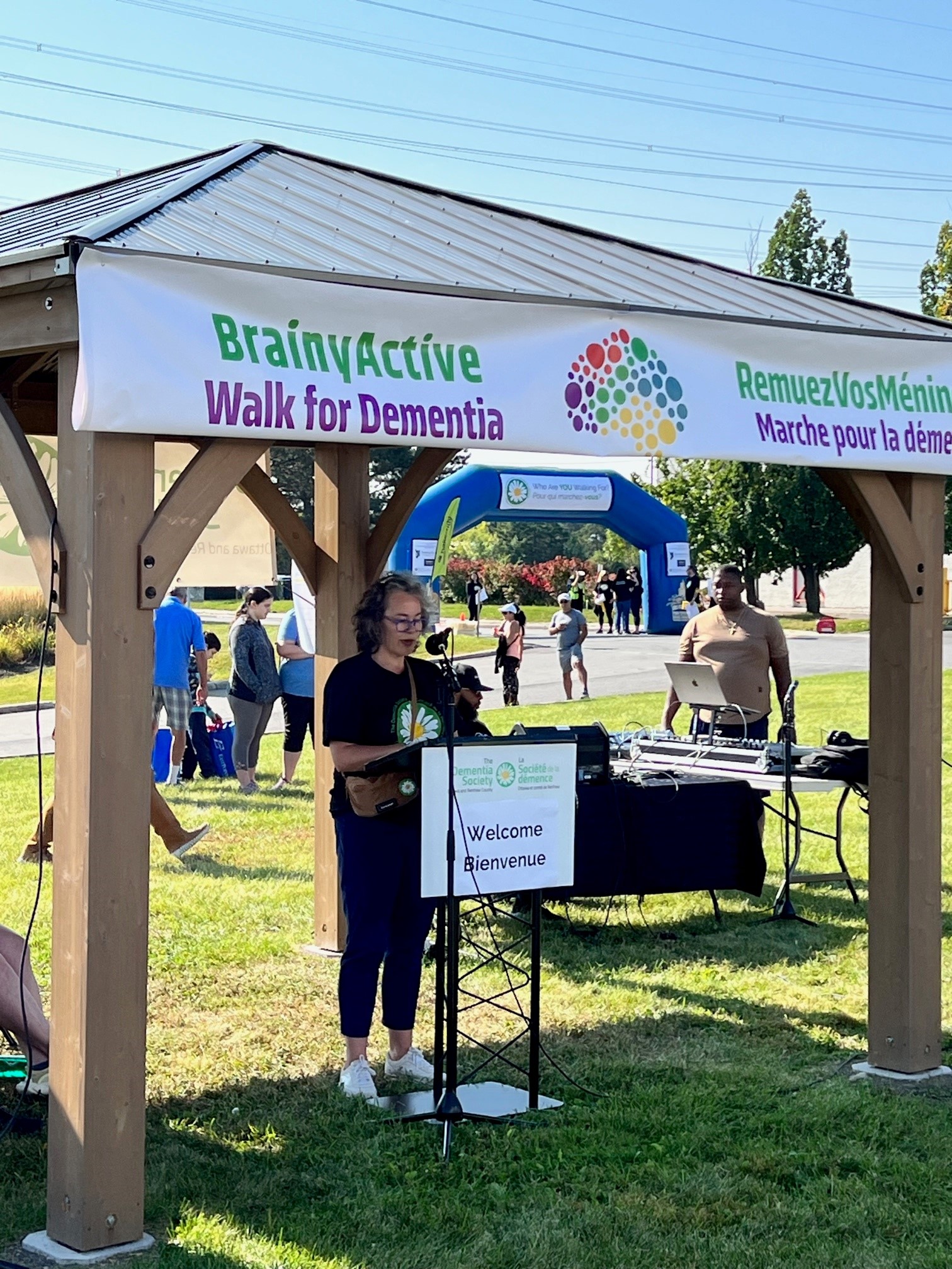 Thumbnail of a group standing in front of the Dementia Society banner.  Thumbnail of Kelly Milne and guests.  Speaker welcoming guests to a Dementia Society outdoor event.  Guests in watching white t-shirts participating in an outdoor Dementia Society event.