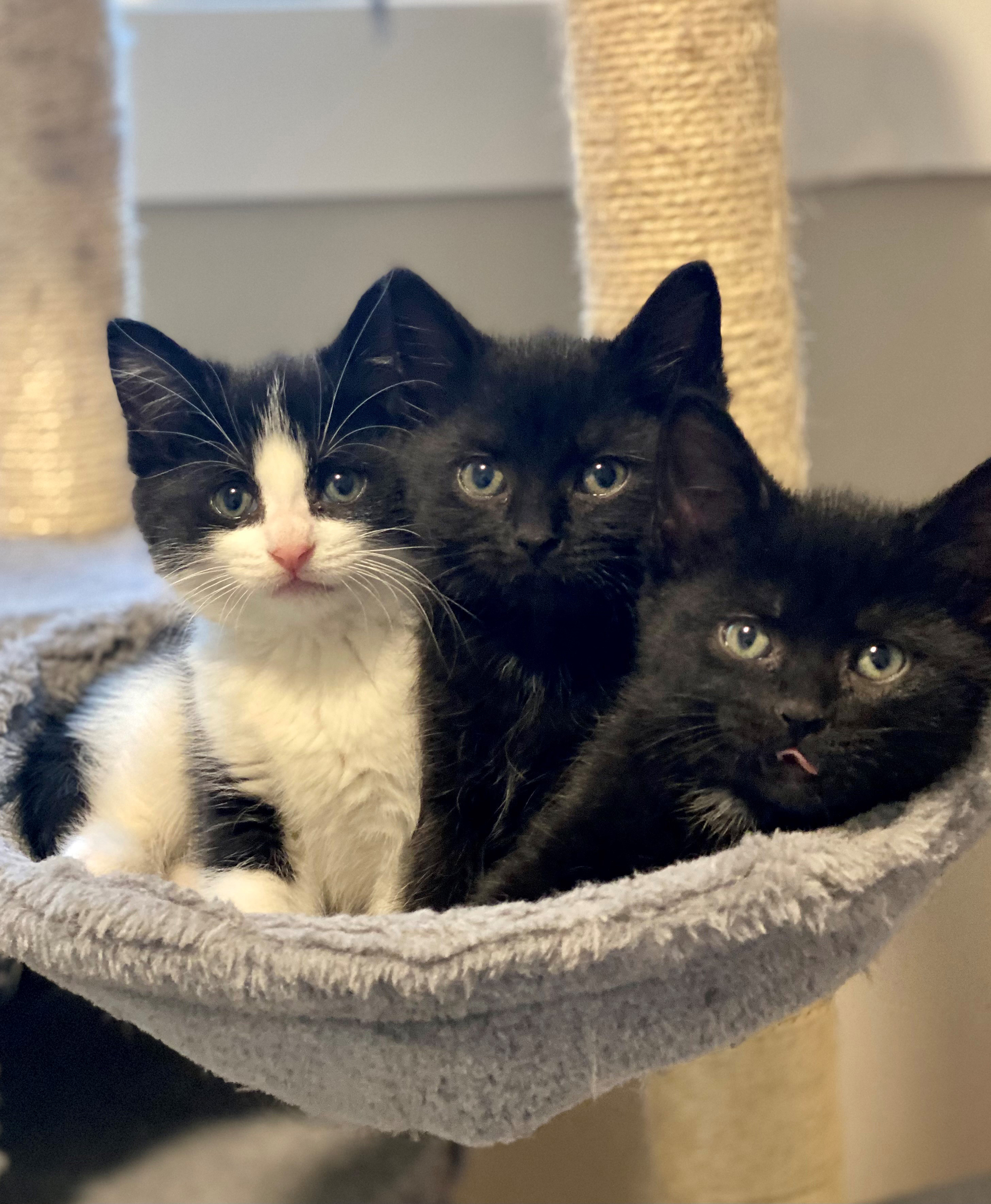 Three kittens on a cat climbing tree. Two are all black, one has white markings on its face and front.  Two grey cats resting on a cat climbing tree. They look like they're hugging.  Very young orange kitten eating messily from a food bowl.  Grey and white kitten asleep on a carpeted stair.