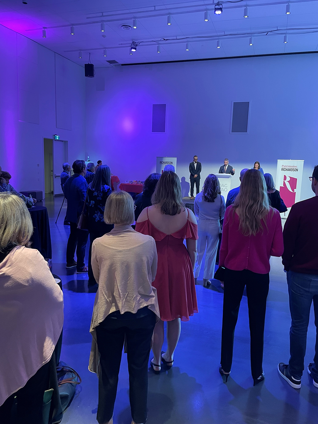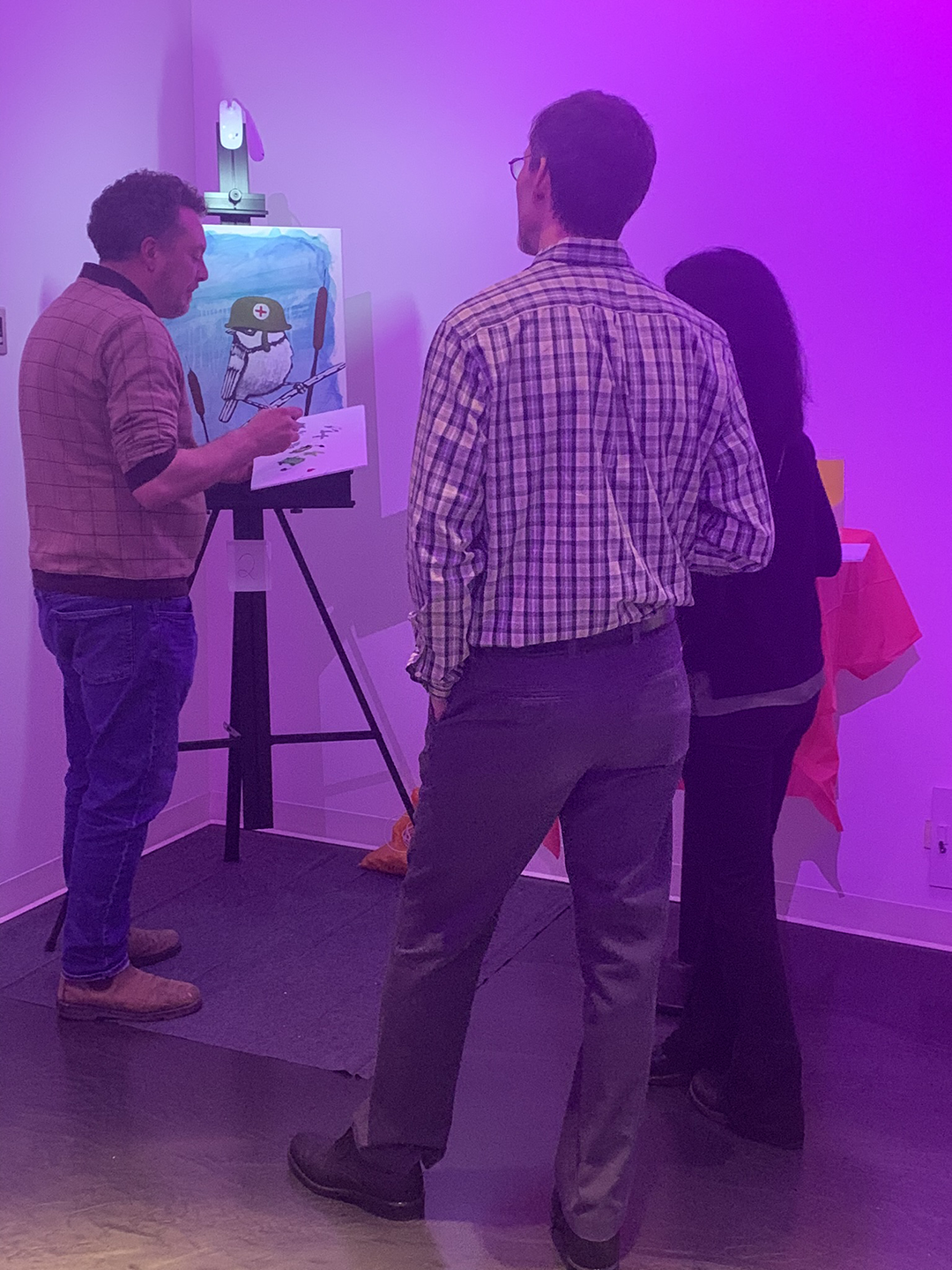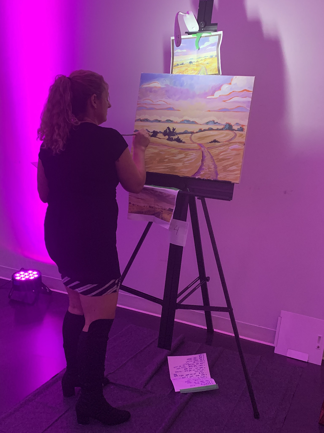 Two guests watching an artist at an Art Battle  An artist at an Art Battle. She is panting a landscape with vivid colours.  Speakers on stage with a podium at an Art Battle. The Richardson Wealth banner stands nearby.  Artist painting at an Art Battle. She is painting an abstract woman with billowing white hair.